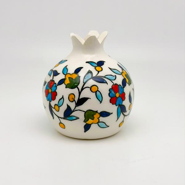 A small 3-inch ceramic pomegranate hand-painted with red and blue flowers. Perfect as a colorful decorative piece for shelves, tables, or desks, and can also hold tiny flowers.
