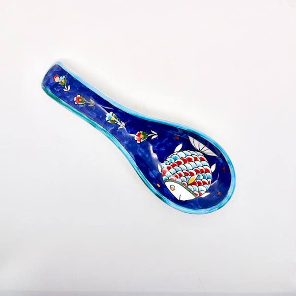 Handpainted spoon rest, featuring a cheerful fish design set against a rich dark blue background. Both functional and decorative, it keeps your countertops clean while bringing a touch of coastal-inspired artistry to your cooking space. perfect for everyday use or as a thoughtful gift.