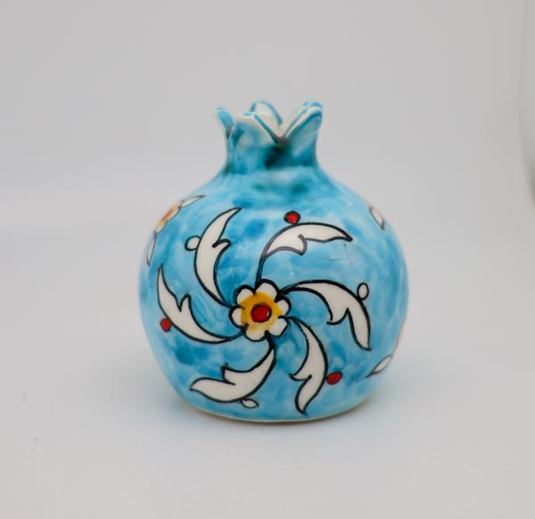 A charming 3-inch hand painted ceramic pomegranate in light blue color, perfect for adding a pop of color to any space. Its compact size makes it ideal for shelves, desks, or bedside tables, and it can even be used as a tiny vase for small flowers.