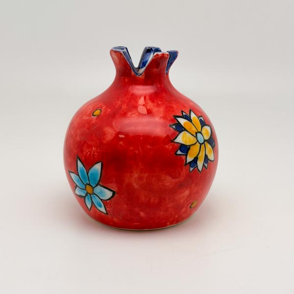 A small 3-inch ceramic pomegranate with a red background and hand-painted blue flowers. A bright, eye-catching decorative piece for shelves, tables, or desks, and can also be used as a tiny vase for small flowers.